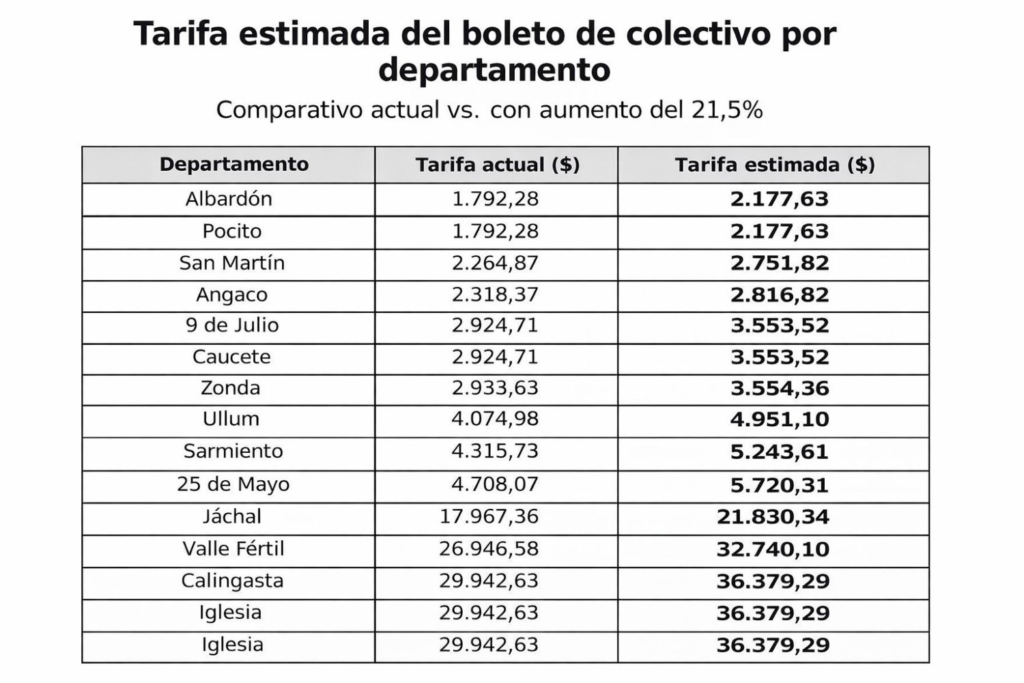 Para los departamentos más alejados, el aumento es aún más marcado. Los viajes a 9 de Julio y Caucete se ubicarían en torno a los $3.553,52, mientras que Zonda alcanzaría los $3.564,36. En tanto, Ullum rondaría los $4.951,10 y Sarmiento superaría los $5.243,61.