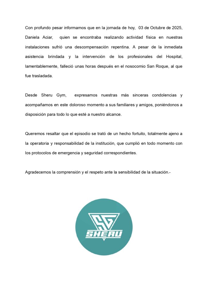 Los propietarios del gimnasio “Sheru Gym” emitieron un comunicado luego de la tragedia de la tarde del viernes donde murió una joven jachallera de 31 años, luego de descompensarse realizando actividades físicas en el mencionado local.