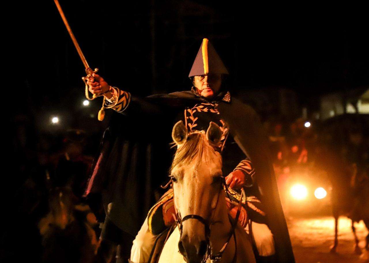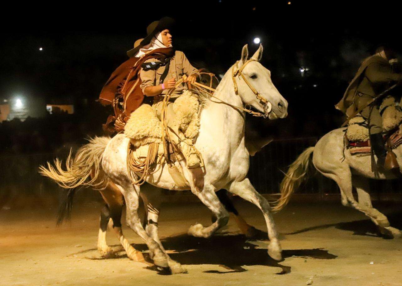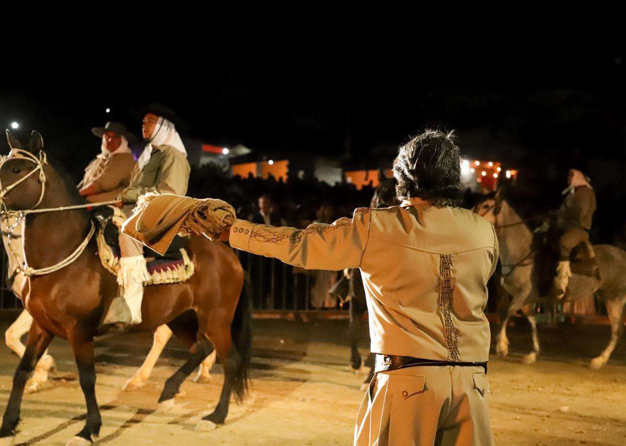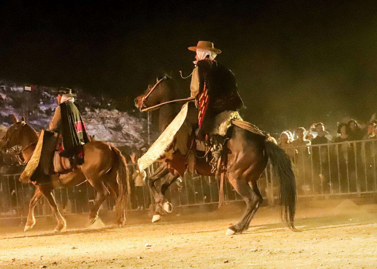 Con antorchas, ponchos al viento y la fuerza del recitado tradicional, los gauchos hicieron su ingreso recreando el antiguo paso cordillerano, evocando aquellas largas travesías donde el coraje, la camaradería y la fe en la tierra guiaban cada jornada de trabajo.