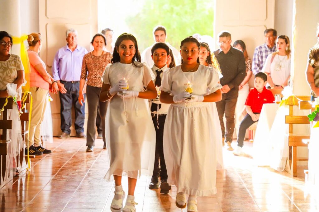 El encuentro reunió a vecinas y vecinos de la comunidad, quienes compartieron una solemne procesión en honor a la patrona, seguida de la Santa Misa presidida por el Padre Rodrigo Sáenz Peña, durante la cual niños y niñas de la localidad recibieron su Primera Comunión, en un marco de profunda emoción y fe.